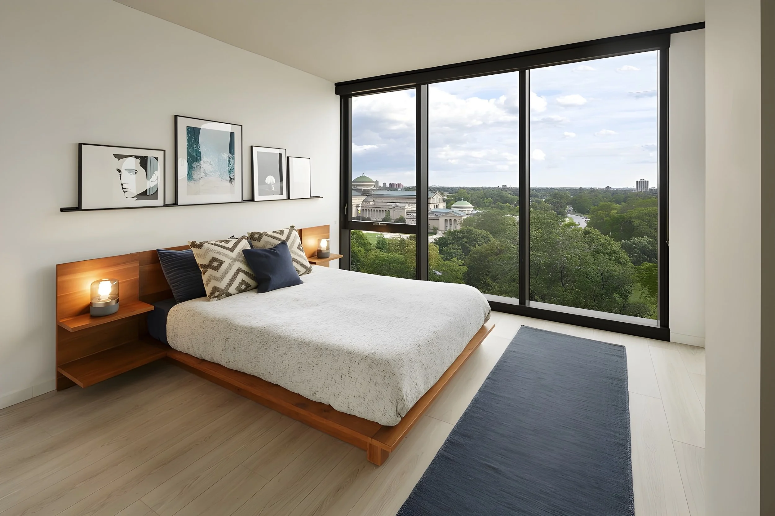 This bright luxury one-bedroom, one-bathroom apartment offers approximately 700 sq/ft of thoughtfully designed living space, with expansive windows showcasing impressive views over Jackson Park. The open-plan layout allows natural light to flow throughout, highlighting warm wood flooring and clean, contemporary finishes.