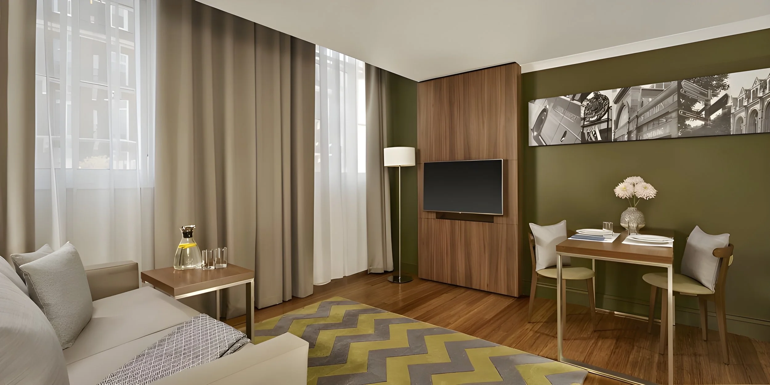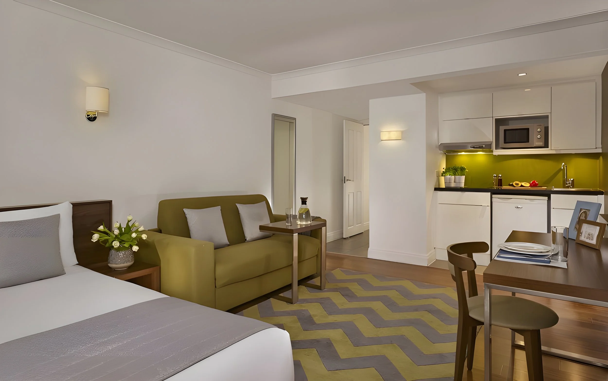 Each apartment is fully furnished and thoughtfully equipped for everyday living, featuring a fully fitted kitchen, dedicated desk space, and a modern bathroom with complimentary luxury toiletries. Comfortable interiors include sumptuous beds, elegant lounge areas, and in *select units sofa beds for added flexibility. Residents also benefit from air conditioning, fast Wi-Fi, elevator access, *24/7 security staff, concierge services, and gym access, creating a well-rounded and supportive living environment.