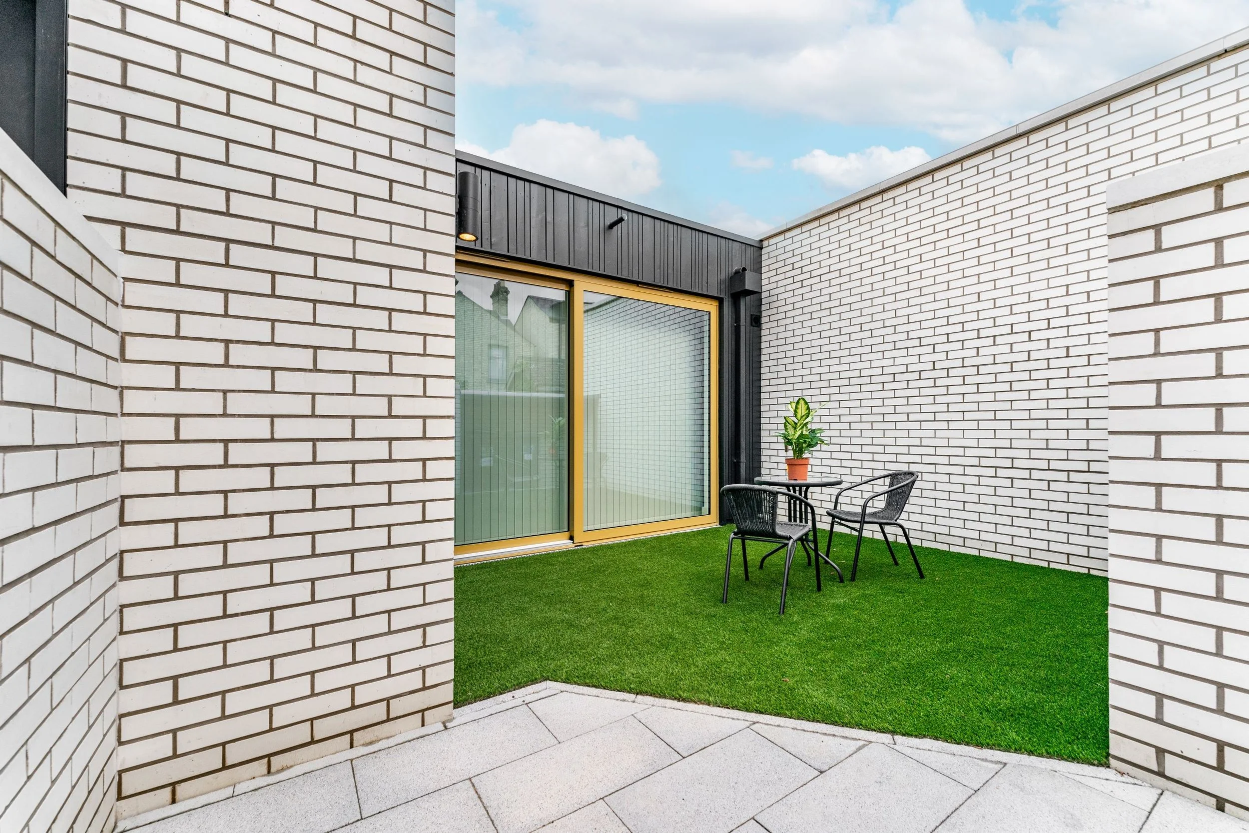 These one-bedroom apartments offer both privacy and style, featuring reflective glass for seclusion and a gated outdoor space with bicycle storage. Inside, the atmosphere is calm and contemporary, with an open-plan kitchen fully equipped for home cooking, including a built-in microwave, and a spacious living and dining area highlighted by touches of gold and soft grey tones. The bathroom is designed for comfort and elegance, complete with a Velux window that floods the space with natural light and an illuminated LED mirror for a modern finish.