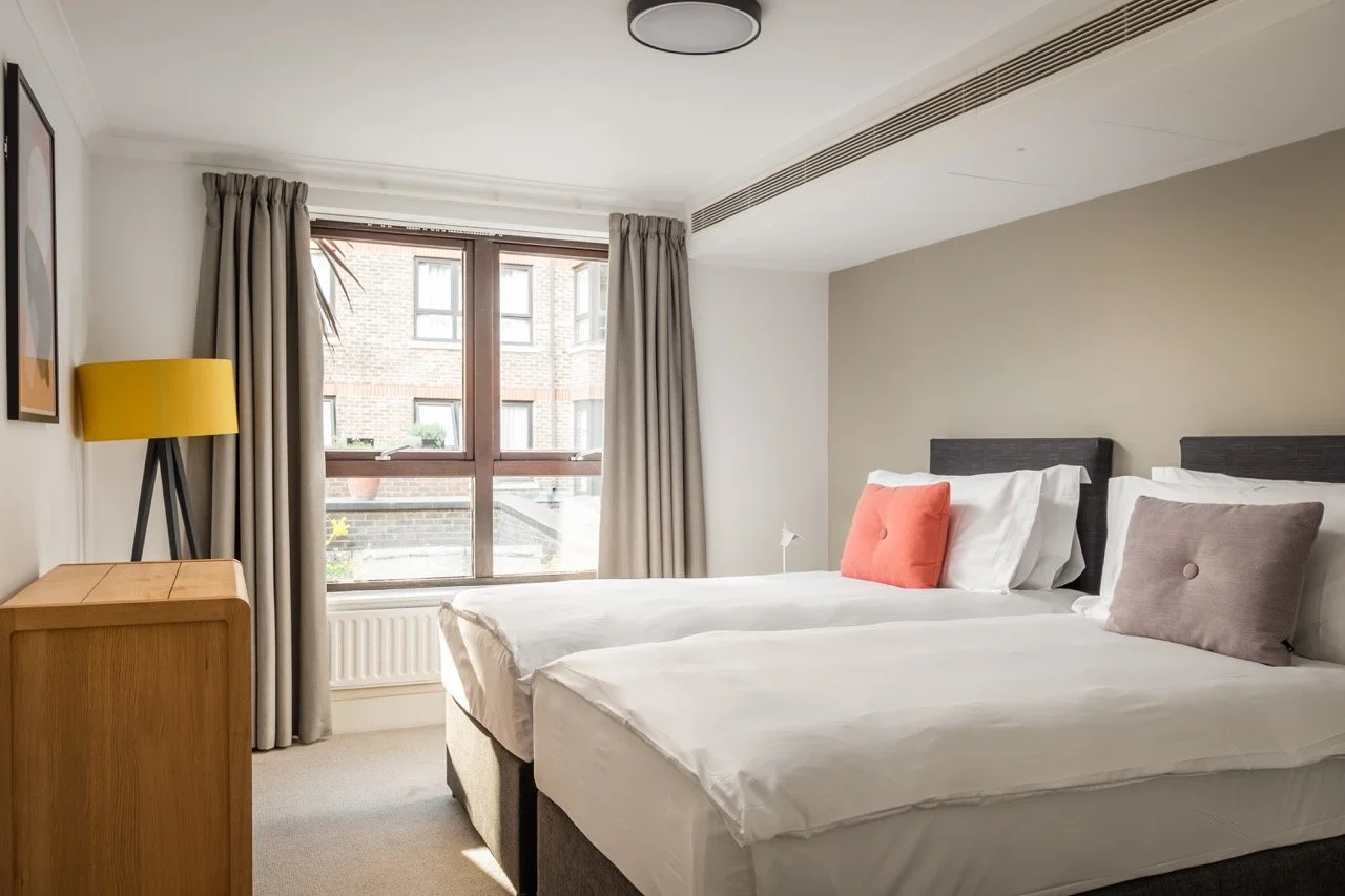 The bright open-plan living area is designed for relaxing or entertaining, while the fully equipped kitchen features integrated appliances, a dishwasher, and in-unit laundry to make daily living effortless. With lift access, contemporary interiors, and thoughtful touches throughout, these apartments deliver a superb blend of space, style, and practicality for an elevated London stay.