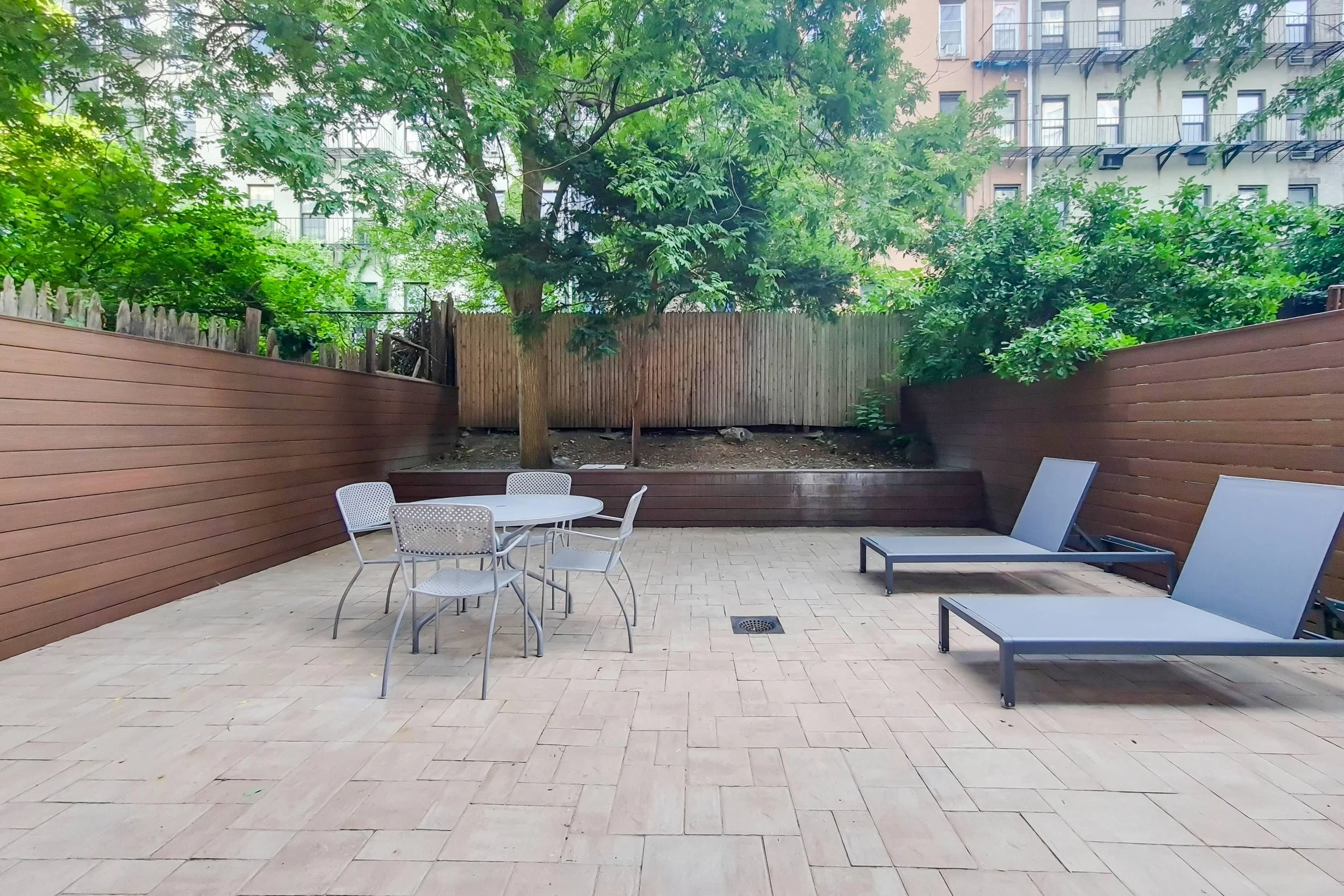 A private outdoor patio provides a rare city escape, offering space to unwind or enjoy fresh air in a quiet setting. Air conditioning ensures comfort throughout the year, while building amenities include on-site laundry facilities, and a pet-friendly policy, completing a well-located and comfortable Upper East Side residence.