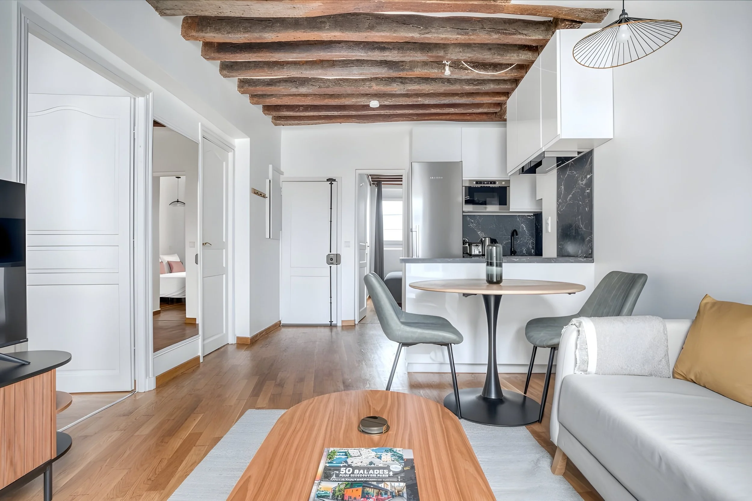 Both bedrooms are designed for comfort and relaxation, complete with superior-quality mattresses, luxury linens, and plush towels. The principal bedroom features a queen-size bed, while the second offers a comfortable double. An in-unit washing machine, dishwasher, and Nespresso machine add ease and convenience, making this a refined Parisian home ideal for longer stays.