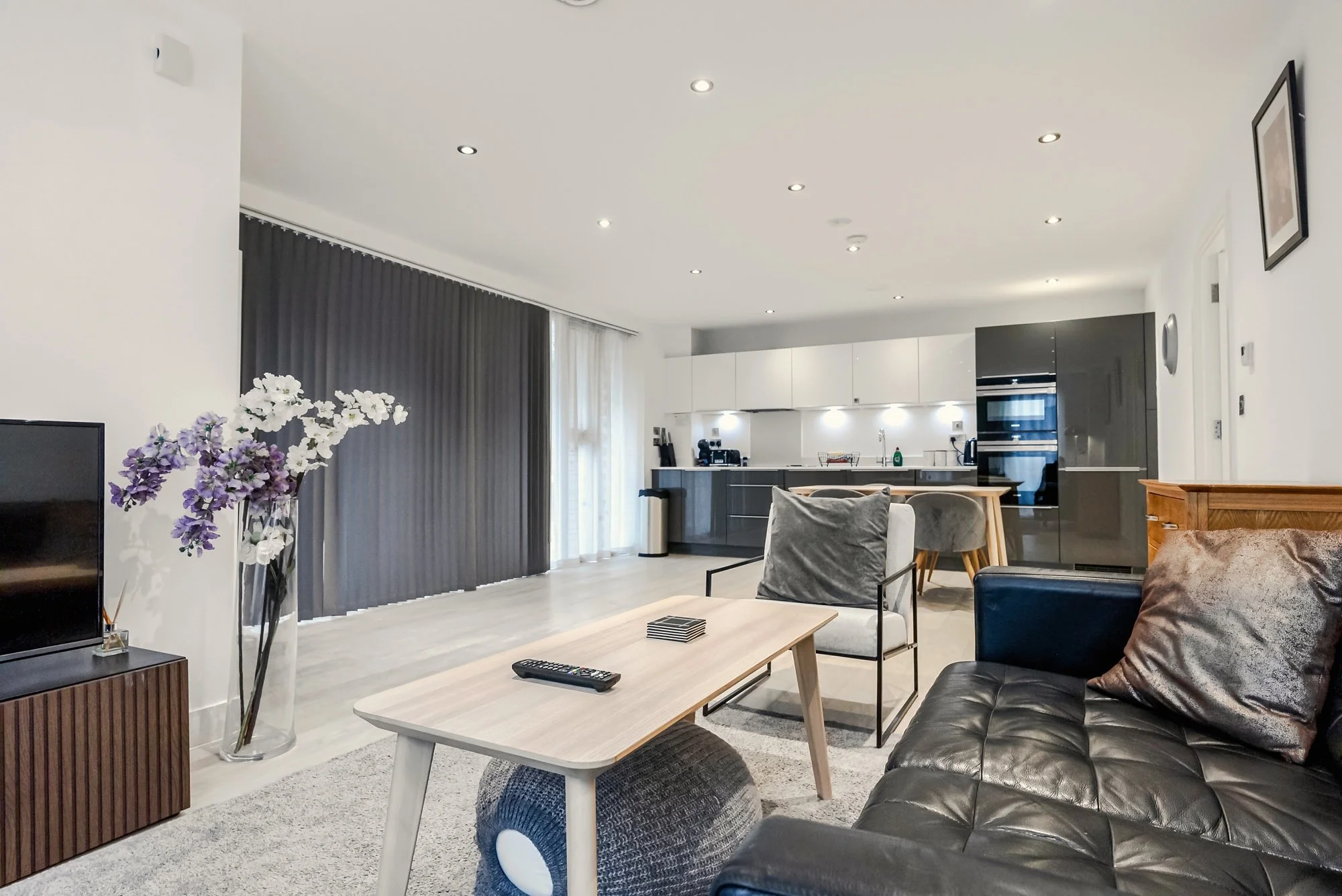 This contemporary two-bedroom apartment offers 82 sq/m of well-designed living in a desirable Cambridge neighbourhood. The open-plan living space features stylish furnishings, a Smart TV, super-fast Wi-Fi, and a fully fitted kitchen with modern appliances and dining essentials. Underfloor heating throughout the apartment adds a refined, modern touch.