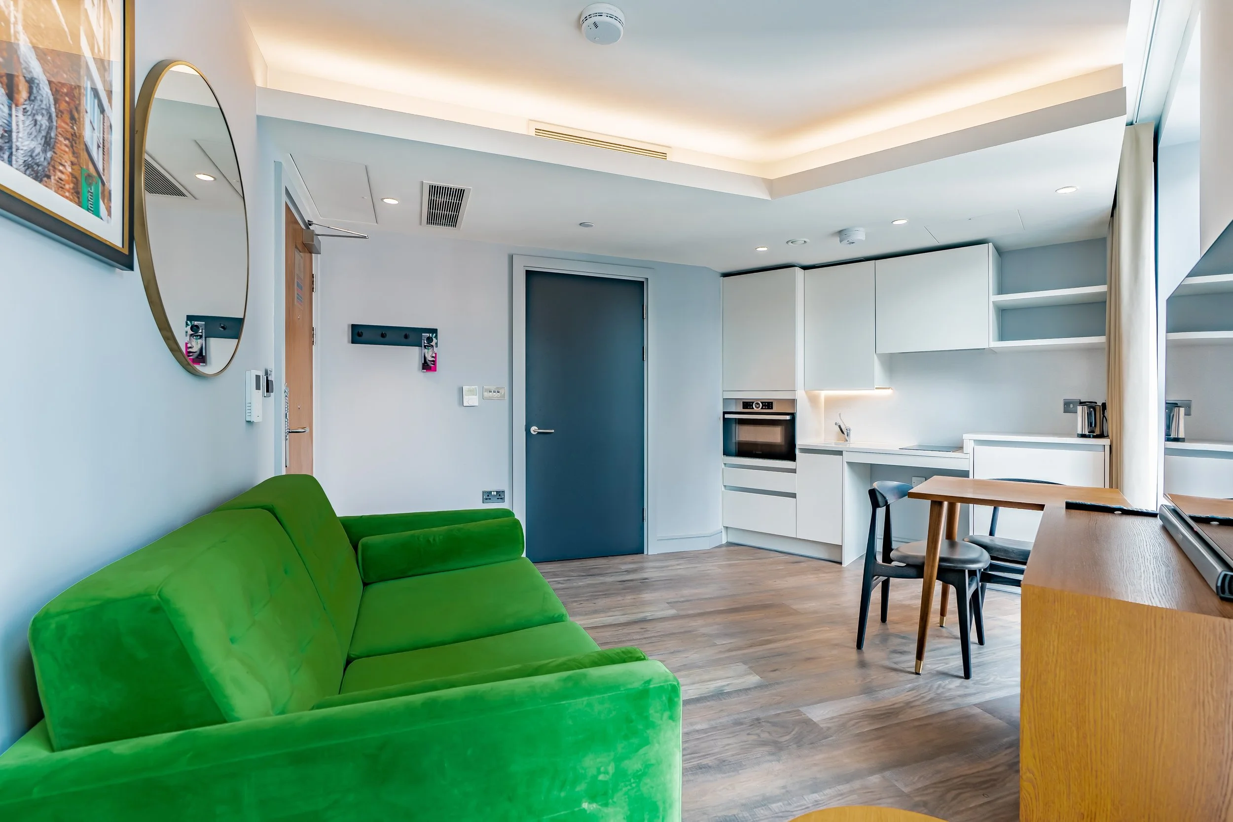 What sets these studios apart is the added benefit of in-unit laundry, providing complete independence during your stay. Guests can also enjoy 24/7 reception support, a welcoming pet-friendly policy, and access to a scenic rooftop terrace overlooking the London skyline, an ideal spot to unwind or catch a breath of fresh air above the city.