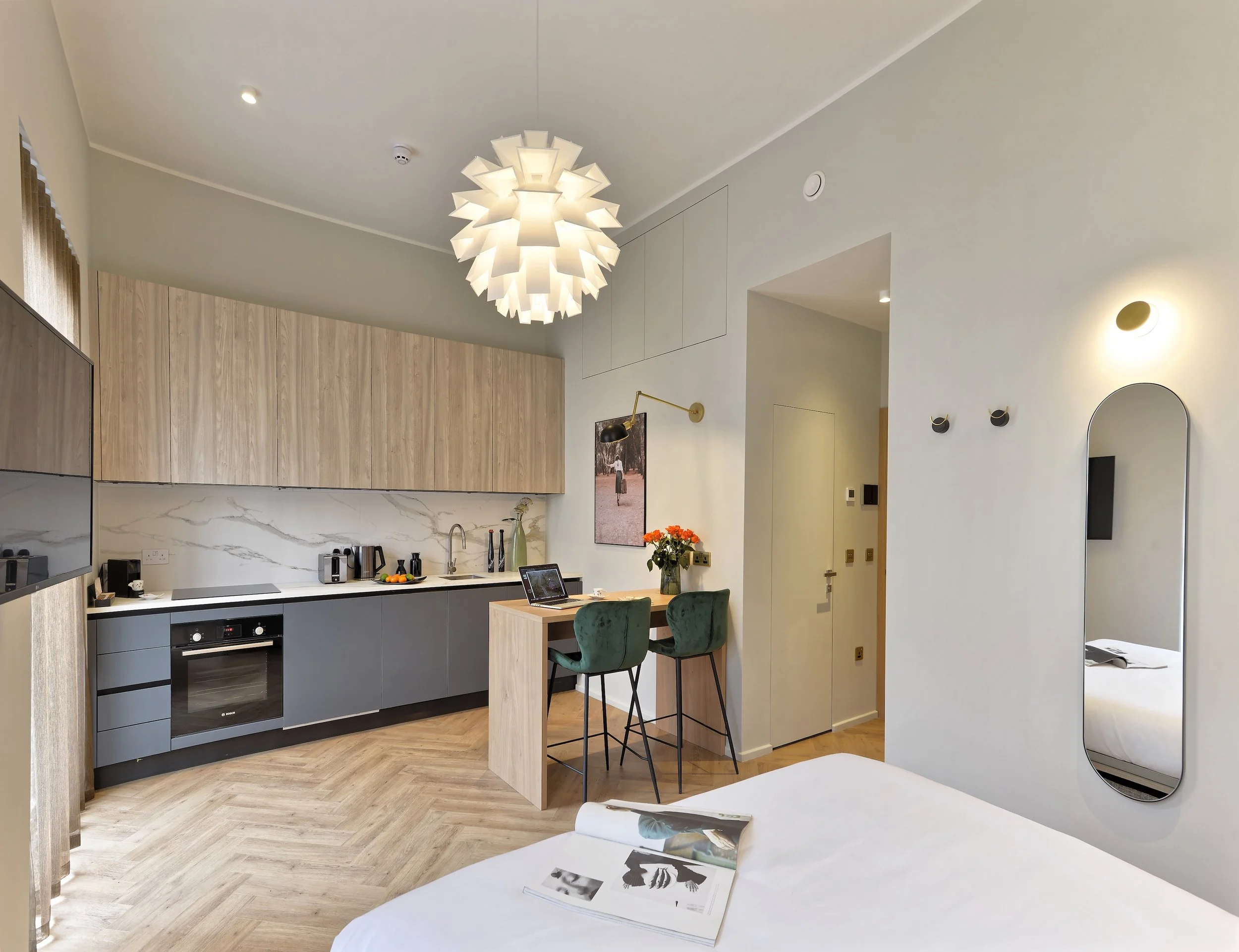 Elegant and beautifully designed, these studio apartments offer bright, well-proportioned spaces with refined interiors and a seamless blend of style and functionality. The open-plan layouts feature comfortable sleeping and living areas with sofa beds, alongside fully furnished, modern kitchens, all enhanced by warm wooden flooring and underfloor heating for year-round comfort.