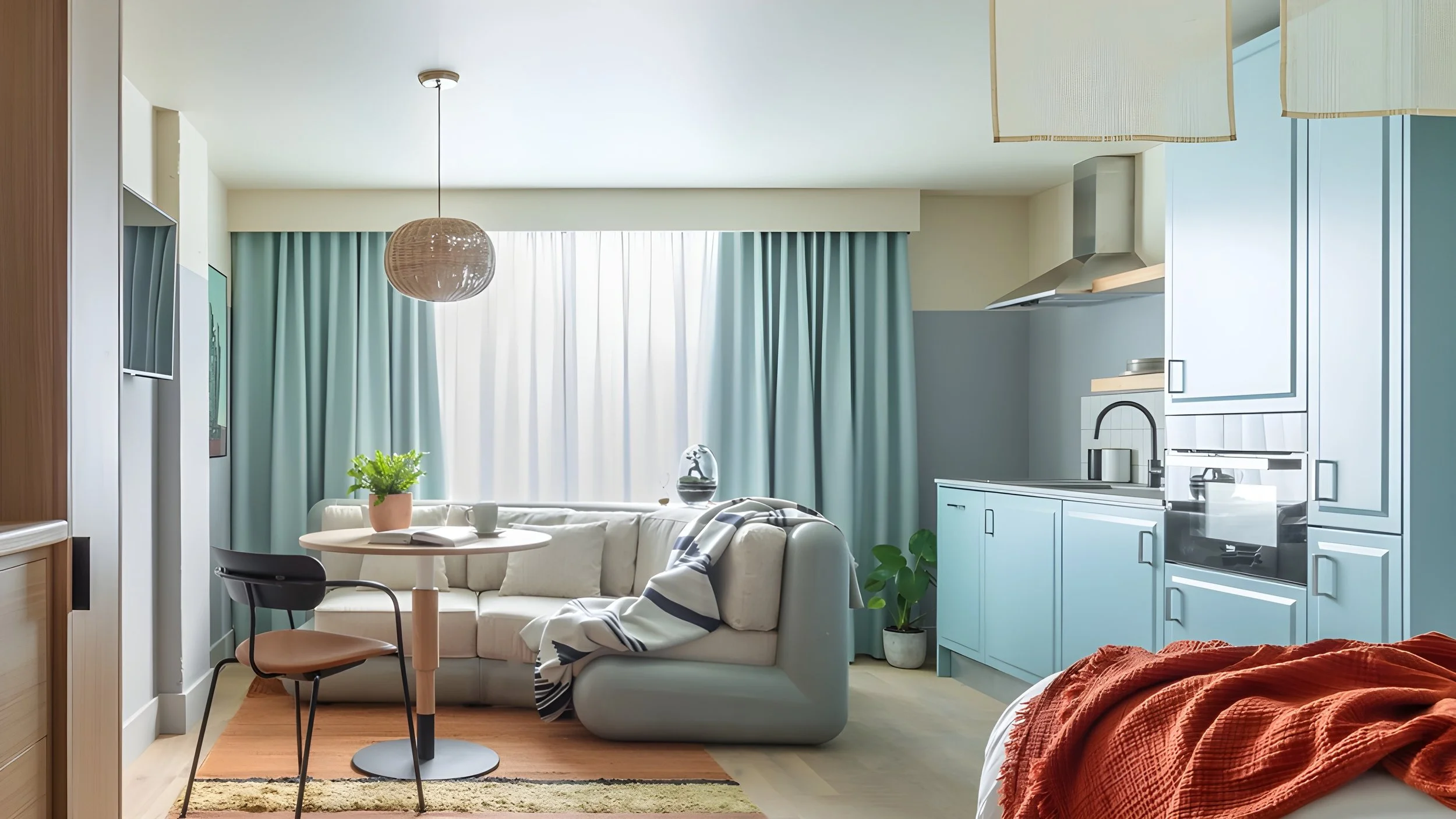 This one-bedroom apartment is thoughtfully styled with warm, natural tones and textured finishes, drawing subtle inspiration from the Californian desert. Brass accents, concrete details, rattan elements, and lush greenery create a calm, creative atmosphere that feels both distinctive and inviting.